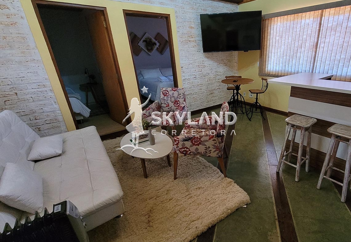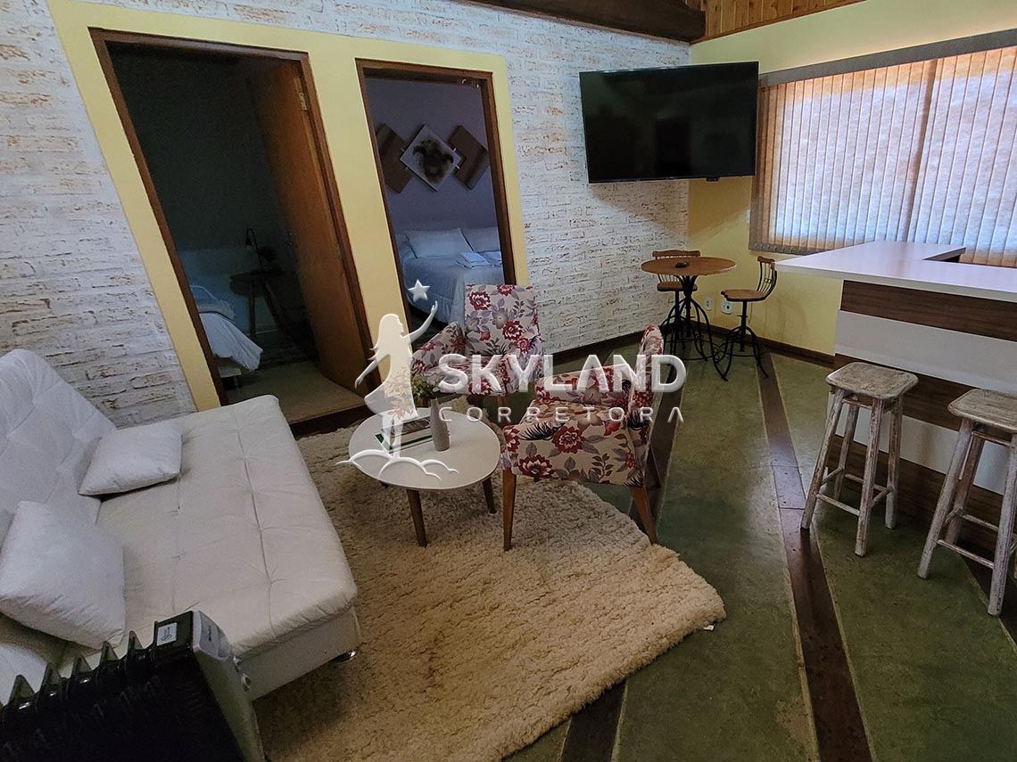 ✨ Possui dois apartamentos amplos muito confortáveis, com excelente acabamento, minicozinha, lareira e sacada. Um dos apartamentos possui sala de estar com lareira e dois quartos, ideal para hospedagem de família ou grupo de amigos.